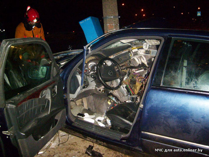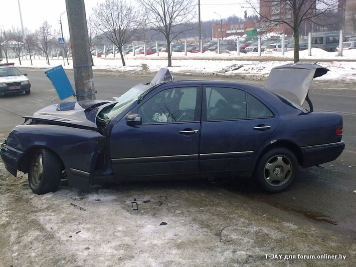 Эта авария произошла сегодня рано утром в Минске. На ул. Алтайской Mercedes E320 врезался в столб. Пострадала молодая пассажирка, в тяжелом состоянии она была госпитализирована, сообщили в пресс-службе Минской ГАИ. Участнику форума Auto Onliner T-JAY удалось сделать фото с места происшествия.
