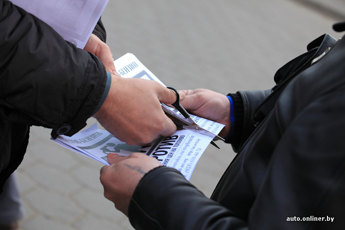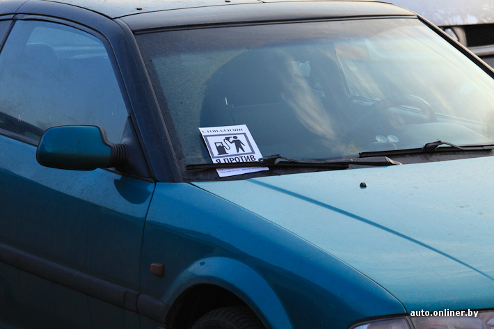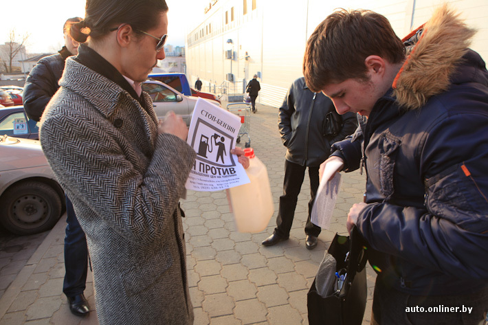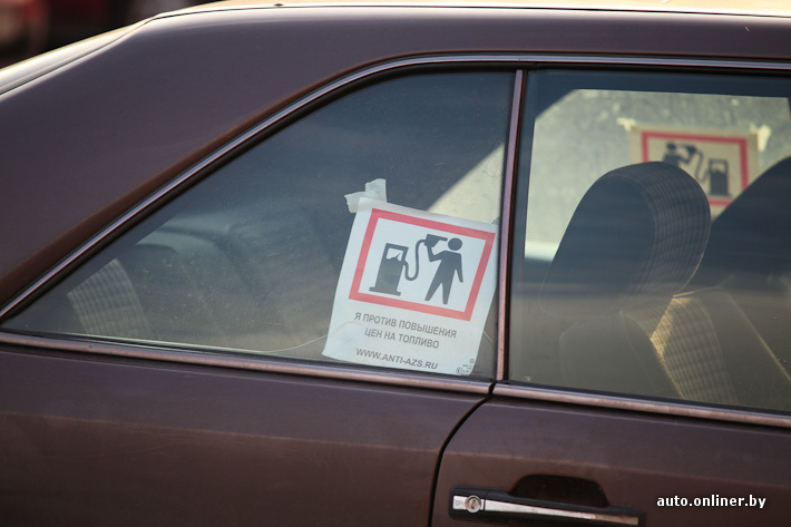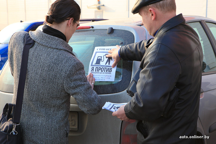 Всем участникам, а также автомобилистам, которые узнали о флешмобе только на пороге торгового центра, раздавали наклейки «Стоп-бензин. Я против повышения цен на топливо».