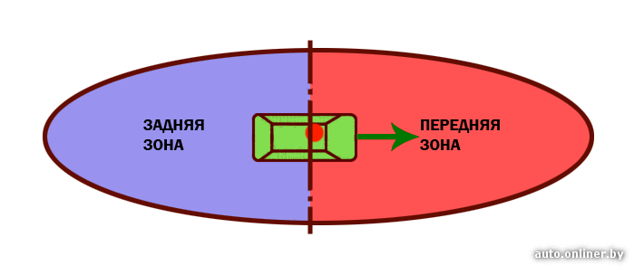 Вопрос хороший и важный. Но я предлагаю его сформулировать немного по-другому. Я уже упоминал в одной из публикаций, что пространство, окружающее водителя автомобиля, можно разбить на две зоны: переднюю и заднюю. В некоторых источниках по безопасности движения дано определение и боковой зоны, но я предлагаю все-таки делить пространство в машине только на две зоны. Если через место водителя провести плоскость, перпендикулярную продольной оси автомобиля, то как раз и получается: передняя зона перед водителем, задняя зона — за его спиной.