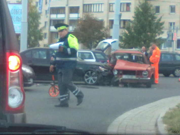 Сегодня, около 13:30, на перекрестке улиц Шаранговича и Горецкого произошла авария: BMW, за рулем которого была женщина, врезался в ВАЗ с пожилой парой. «Водитель ВАЗа не уступил дорогу BMW, — сообщили в ГАИ Фрунзенского района. — По словам очевидцев, ВАЗ от удара практически приобрел форму дуги. Известно, что пострадали мужчина в возрасте и его супруга, находившиеся в „Жигулях“».