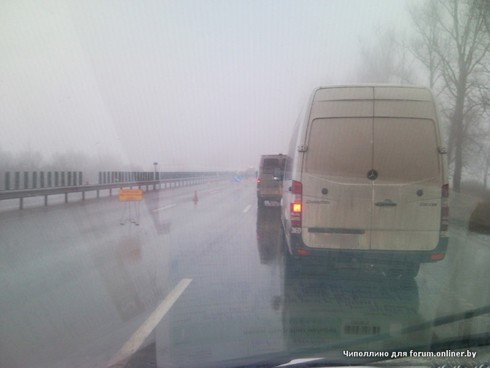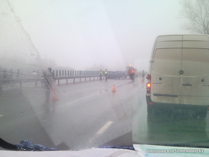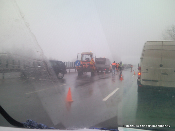 Форумчанин Voody_dJ уточнил: «Ехал около 8:00 в Минск, все три полосы были открыты (ремонта не было). Через часа 1.5 возвращался назад, на встречке видел перевёрнутую машину, подходили люди заглядывали внутрь, чуть далее в отбойнике ещё одна машина без переда. Скорее всего битых машин больше, но эти две в глаза бросились. Собралась большая пробка и уже подъезжала машина МЧС. Туман ужасный, будьте аккуратней».