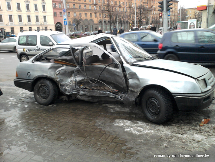 Сегодня утром на пересечении пр. Независимости и ул. Сурганова произошла авария с участием двух автомобилей — по предварительной информации, Renault Megane и Ford Sierra. Судя по фотографии, произошло боковое столкновение. Как сообщают очевидцы, в результате удара правая сторона Ford была сильно повреждена, она оказалась вдавлена в салон. Сведений о пострадавших в этом ДТП нет.