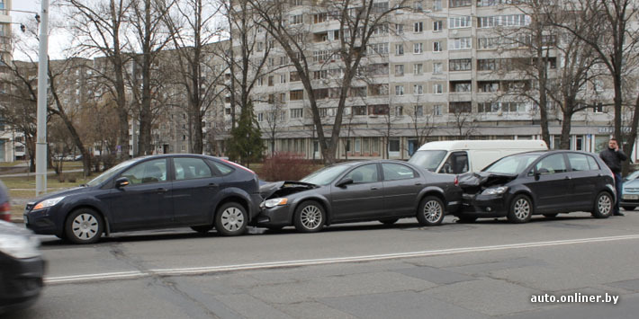 В ГАИ уточнили: «Женщина управляла Volkswagen Golf и двигалась по ул. Богдановича (со стороны ул. В. Хоружей в направлении пр. Машерова) по второй полосе. По предварительным данным, она проявила невнимательность и врезалась в Chrysler. Тот продвинулся и совершил столкновение с Ford. Последняя машина врезалась в Kia, та — в Peugeot, а Peugeot — в Audi. Пострадавших в ДТП нет».