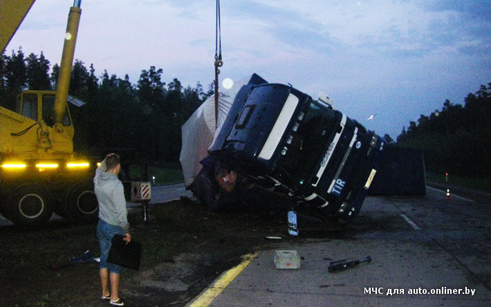 Вот что написал наш пользователь (особенности авторской орфографии и пунктуации сохранены): «Выехал в 19-30 из Минска по Лагойке в Витебск. Пасмурно. Минчане возвращаются с выходных, идут плотным потоком. У гайцов готовность №1 по встрече кортежа (въезд на стоянки закрыт оранжевыми колпаками, стоит машина ГАИ). Начался небольшой дождик, сильно не топлю, по правой полосе потиху нагоняю, пшека на синей фуре с прицепом. Я даже не понял, что спровоцировало небольшой занос прицепа вправо. Водитель видно хотел поймать хвост, и повернул направо, но от этого прицеп разболтало. Тягач стало выносить на обочину и тут водитель резко выворачивает руль влево. От этого маневра стал заваливаться прицеп, и лег в левой полосе выдавая кучу искр, а заодно и утянул машину, при падении ее развернуло на встречу и вынесло на разделительную полосу. Остановился, подбежал, водитель уже стоял в кабине и жестами показывал, что не пострадал. ГАИ приехали моментально. Капец унитазам (один валялся на дороге)».
