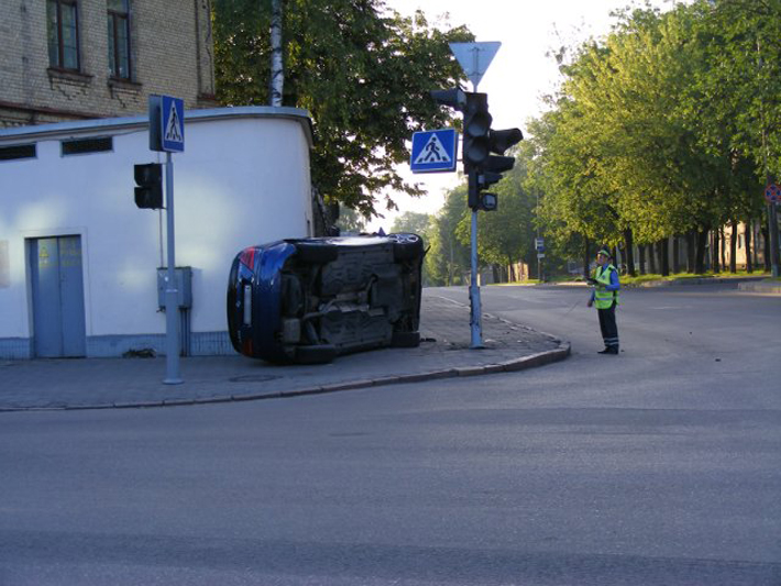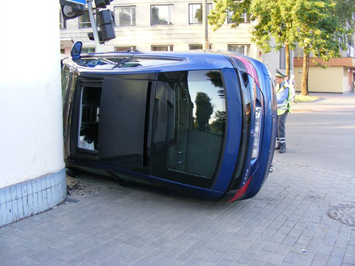 «Свернув на перекрестке направо, Mercedes помчался по улице Дзержинского, — сообщили подробности происшествия инспекторы. — На пересечении с улицей 17 Сентября Mercedes заскочил на тротуар. Врезался в светофор, перевернулся и упал на левую сторону. Водитель вылезал через люк».