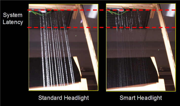 В соответствии с этими данными на проектор выводится специальная картинка с «метками», соответствующими расположению капель, благодаря которой освещается только пространство между частицами осадков. Это позволяет избавиться от бликов и улучшить видимость в плохую погоду.