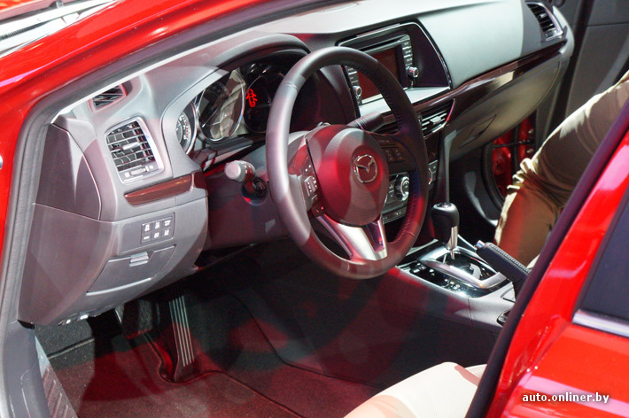 На стенде Mazda в Москве стоит машина с 2-литровым 150-сильным бензиновым мотором SkyActiv, степень сжатия которого составляет 14:1. С ним в паре работает 6-ступенчатая автоматическая коробка передач. В этой модели японцы также впервые представили систему рекуперации энергии торможения (i-ELOOP). Она экономит топливо и сокращает уровень вредных выбросов в атмосферу.