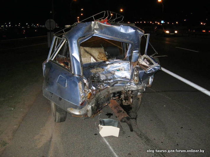 Чуть позже авария действительно произошла. В «Жигули» врезался микроавтобус Mercedes. Участник форума mboss, представившийся водителем последнего автомобиля, рассказал на форуме Onliner.by, что случилось: «Ехал по кольцевой в раене (Бигз) не заметил стоящее жигули в втором ряду,с оторваной шаровой.Снес ее на скорости 80-85 км . Реально машину не видно было .Жив , голову зашили , больш повреждений по себе не выявлено ,бус (мв100) думаю востанавливать нет смысла, хотя крепкая штука......Жигули воще в хлам ,слава богу в них никто не сидел(думаю люди которые в ней ехали подозревали что этим закончится). Машина стояла в это время суток без фар и аварийки (хотя знак аварийны был уже поставлен ,его увидел перед ударом)».