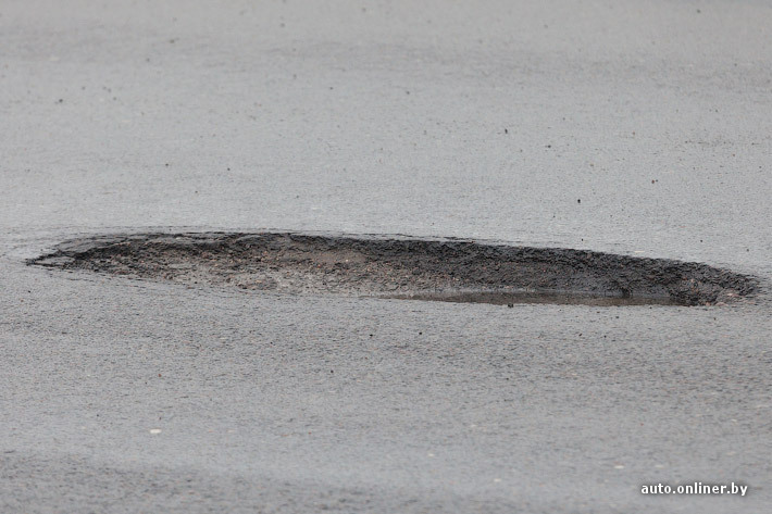 Как оказалось, яма находится в среднем ряду, прямо на путепроводе. К моменту, когда туда приехал наш корреспондент, перед ней уже стоял МАЗ дорожной службы. Рабочие собирались заделывать выбоину. Визуально она попадает под определение критической ямы. Напомним, в стандарте (СТБ 1291) таковой считается образование в дорожном полотне размером более чем 0,3 на 0,3 метра и глубиной более 5 см. Если в такую выбоину заехал автомобиль и получил повреждения, то можно смело вызывать ГАИ. Это будет оформлено как ДТП.