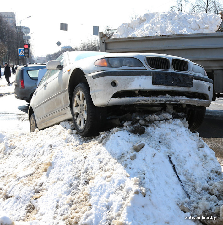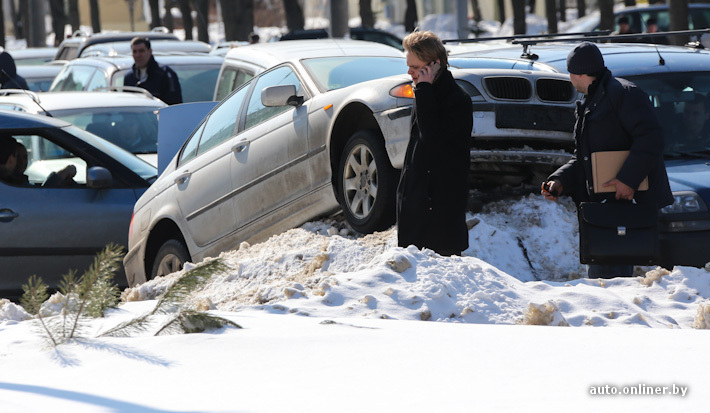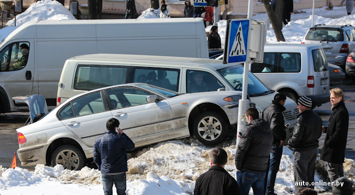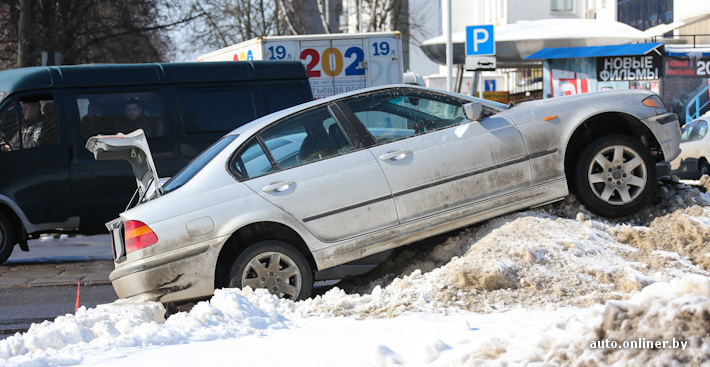 На снежный вал заскочил BMW 3-Series. Заехав на сугроб, машина так и осталась в диагональном положении. Авария произошла на пересечении улиц Якуба Коласа и Хмельницкого, сообщили очевидцы. «BMW застыла на сугробе а-ля памятник идущему на взлет самолету-истребителю эпохи 1940х», — прокомментировал ситуацию пользователь нашего форума iks, видевший последствия ДТП (орфография и пунктуация автора сохранены).