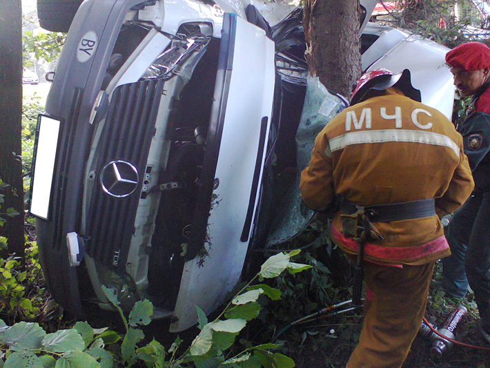 Фургон, вылетев за пределы проезжей части, перевернулся и врезался в дерево. Понадобилась помощь спасателей, чтобы извлечь из разбитой машины водителя. Мужчину (1986 г.р.) госпитализировали с предварительным диагнозом "ушиб грудины, порезы лица, закрытая черепно-мозговая травма". Водитель Audi A6 не пострадал.
