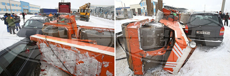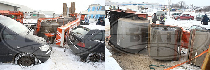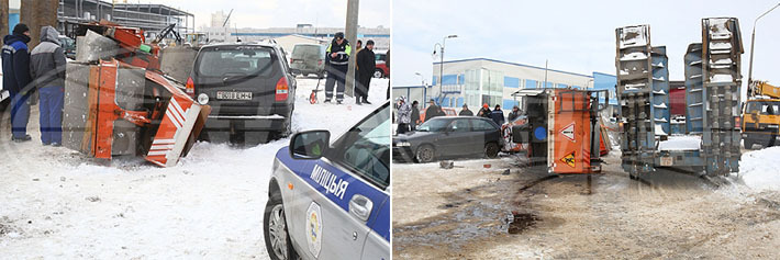 По информации ОНТ, водитель Scania выезжал с территории предприятия и решил, что на повороте не сможет разминуться с припаркованными легковушками. Он хотел объехать этот участок по бордюру. Прицеп накренился, и катки упали. ГАИ выясняет, по чьей вине техника была плохо закреплена на платформе.