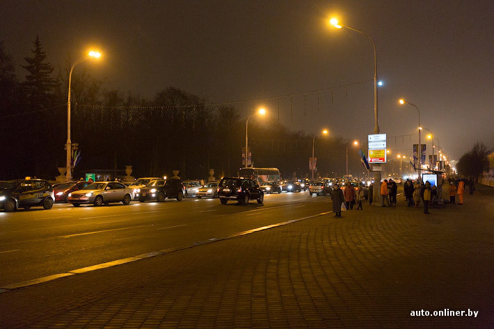 «Кто первый?» — этот вопрос сегодня вечером был у всех на устах: у журналистов, собравшихся на пятачке Октябрьской площади, у сотрудников ГАИ, всматривавшихся в поток, у людей в штатском. Но вся акция ограничилась несколькими гудками клаксонов. Никто из автовладельцев так и не рискнул остановить поток.