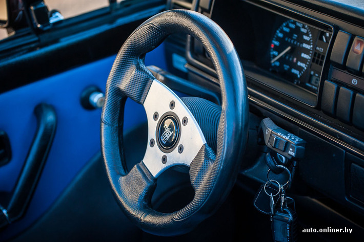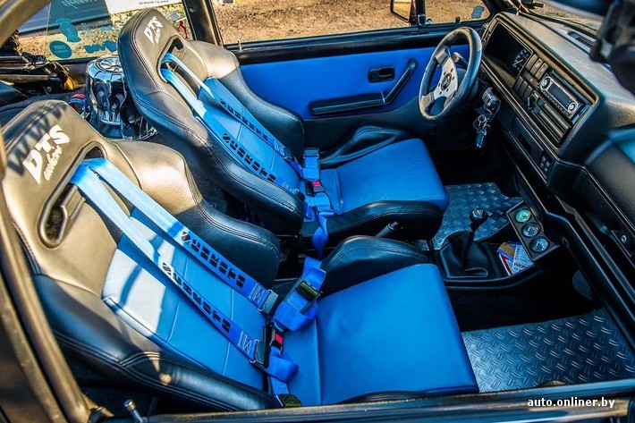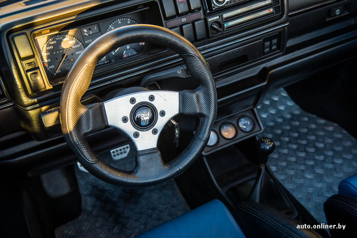 Вместо родных передних сидений, поставили «ковши» фирмы DTS и трехточечные ремни безопасности (Sparco). Инсталлировали торпедо от Volkswagen Golf MK2 GTI. Родной руль заменили на спортивный, который производит фирма Victor. Матерчатые коврики уступили место алюминиевым. Насадка на кулису коробки передач (MOMO). Накладки на педали и ручки стеклоподъемников (JOM).