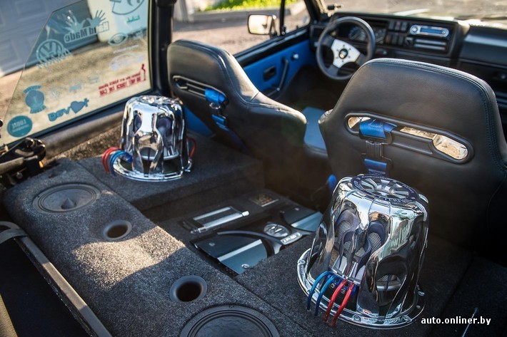 Акустическая система занимает почти весь салон. Ради нее убрали задние сидения. Общая мощность составляет 4500 Вт. Головное устройство (Kenwood 8). Передние и задние динамики — СЧ JBL с усилителем Pioneer 1000 Вт, ВЧ MB Quart. Два сабвуфера AudioBahn, мощностью 450 Вт каждый. Усилитель Cadence ZERO 2 кВт плюс конденсатор на 1 Ф.