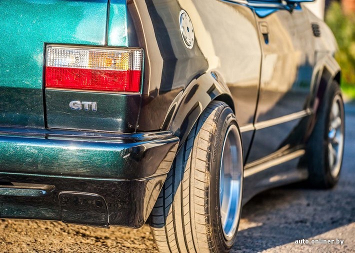 Поставили диски R13 фирмы Shmidt. Сзади стоит резина Continental Sport 195×45, спереди — 175×50 того же производителя. Сняли все значки. Добавили эмблему GTI.