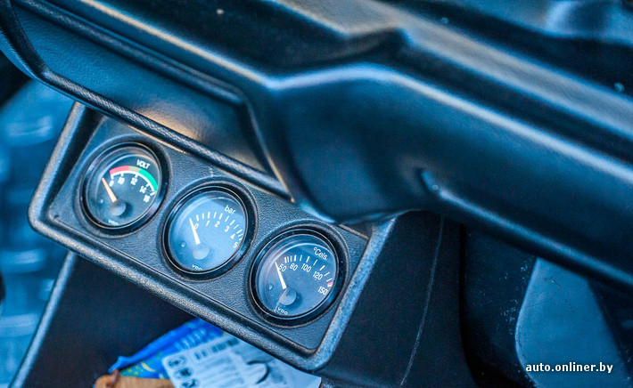 В салоне присутствуют вставки из алькантары. Так как стоит не родной мотор, то для получения большей информации решили установить дополнительные приборы: датчик температуры охлаждающей жидкости, температуры масла, давления масла, уровня зарядки аккумулятора, экономайзер.