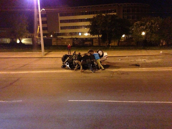 Авария произошла сегодня ночью на пересечении улиц Я. Мавра и Пономаренко. По словам очевидцев, от удара у BMW оторвало колесо, после чего он оказался на крыше. Случайные свидетели переворачивали машину на колеса. Что осталось от автомобиля, хорошо видно на фотографиях, однако водителю не понадобилась медпомощь. Как сообщили в ГАИ, водитель был по визуальным признакам пьян, однако достоверно его состояние установить не удалось.