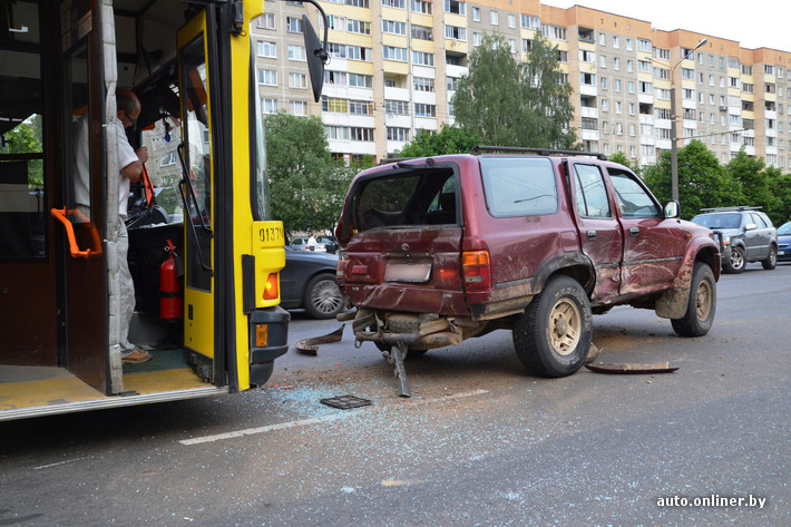 В ГАИ уточнили: оба внедорожника ехали в попутном направлении. Что произошло в этот момент, непонятно, но они столкнулись, и Toyota выехал на встречную полосу. Там он врезался в автобус.