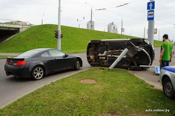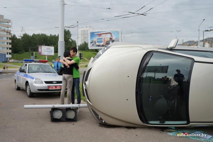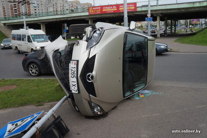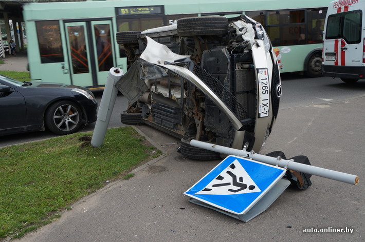 Поворачивая с улицы Руссиянова на проспект Независимости, автомобиль Mazda 3 снес светофор и опрокинулся на бок в нескольких метрах от пешеходов. ДТП случилось сегодня около половины седьмого вечера. По счастливой случайности люди на тротуаре не пострадали, а женщина-водитель отделалась стрессом и порезом руки.