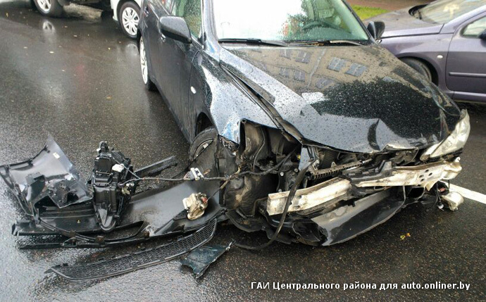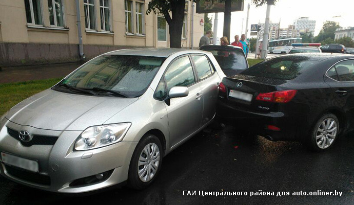 Вчера во время дождя в столице произошел всплеск мелких ДТП. Одна из наиболее серьезных аварий имела место на проспекте Машерова. Возле перекрестка с ул. Куйбышева женщина за рулем Lexus не справилась с управлением и совершила столкновение с двумя припаркованными автомобилями, сообщили корреспонденту Onliner.by в ГАИ Центрального района.