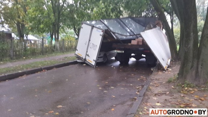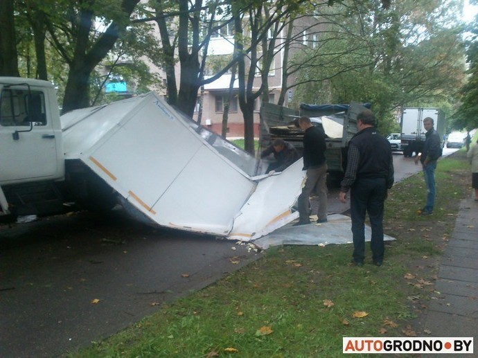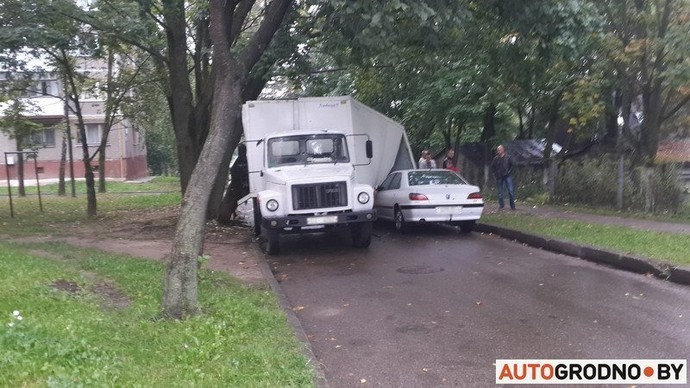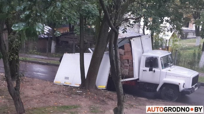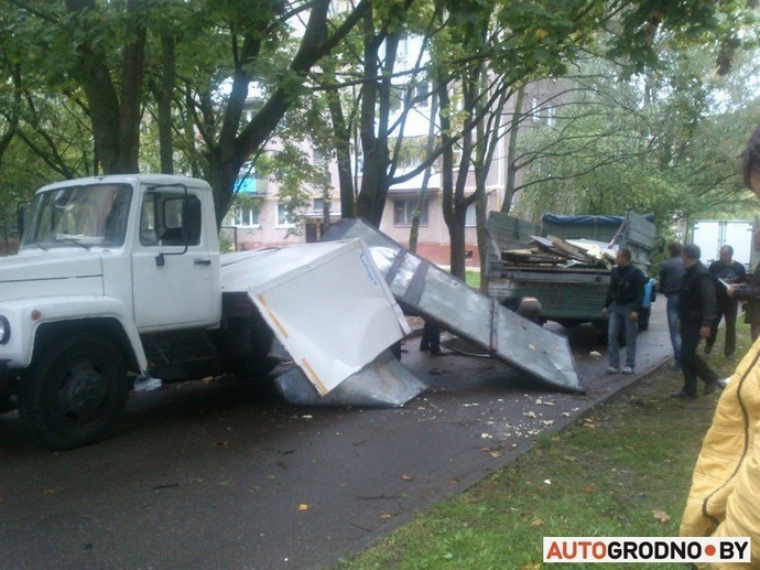 Необычное ДТП случилось вчера в Гродно — на легковом автомобиле оказалась часть кузова грузовика. Не смогли разъехаться ГАЗ-3307 и Peugeot 406. На узкой дороге водитель грузовика взял правее и не обратил внимания на стволы деревьев, которые наклонились над проезжей частью. ГАЗ задел деревья, из-за чего стенки фургона развалились и обрушились на проезжавшую мимо легковушку.