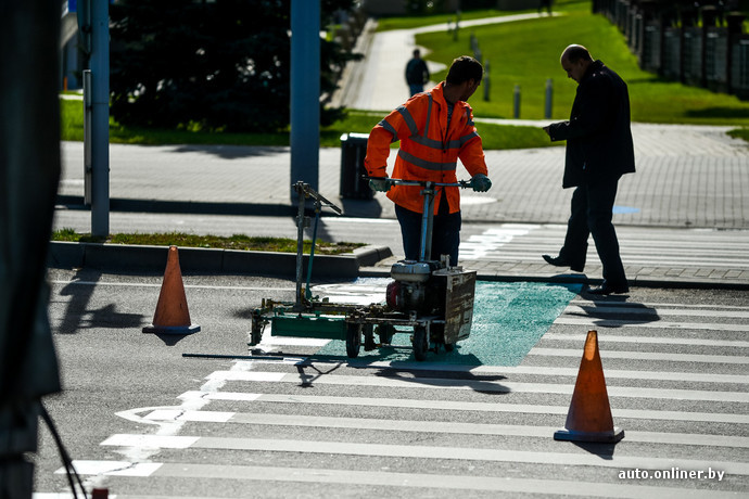 Места пересечения велодорожки и проезжей части некоторых улиц будут обозначены особым образом. На асфальт нанесут «пластик» зеленого цвета. Первая такая разметка уже появилась на проспекте Победителей, сообщили корреспонденту Onliner.by в Минской ГАИ.