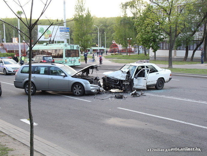 Авария произошла 5 мая около 18:00 на ул. Ангарской в Минске. «Мерс с очевидным превышением скорости двигался по ангарской в направлении пр-та партизанского, незадолго до столкновения мерс начало носить из стороны в сторону и в итоге вылетел на встречку, где и столкнулся с ФМ3. Водитель форда в порядке, был пристёгнут ремнём безопасности, в мерсе находился молодой человек, водитель, и девушка пассажирка, оба были не пристёгнуты, у водителя был разбит только лоб, смог самостоятельно покинуть машину, девушку без сознания увезла скорая», — сообщал у нас на форуме очевидец, пользователь a12milian (орфография и пунктуация сохранены). А через несколько дней появилось видео самого момента столкновения, которое говорит само за себя.