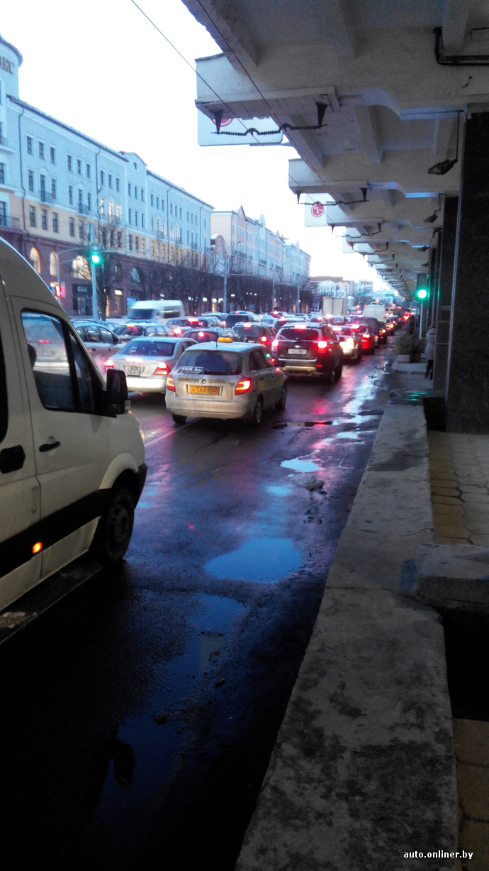 В затор попало большое количество машин. Сообщается, что пробка растянулась по улицам Немига и Богдановича до перекрестка с улицей Я. Купалы.