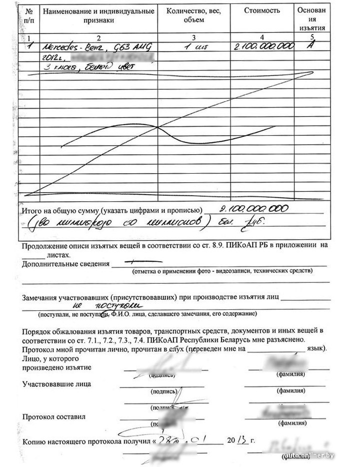 Огромный резонанс получила история 2013 года. Был конфискован дорогостоящий Mercedes G63 AMG. Вот что рассказал нам тогда москвич Дмитрий, которому предназначался автомобиль: «Mercedes привезли из Германии. Там погрузили машину на автовоз, выгрузили в Минске на таможне. Мы подали декларацию, ее одобрили, тогда мы внесли деньги — около 65 тыс. евро. В документах значилась стоимость G63 AMG — 106,9 тыс. евро, бумаги заверены на литовско-белорусской границе. Сумма согласована с таможней при подаче декларации, а также подтверждена немецкой компанией-продавцом, заверена нотариусом и апостилирована». Однако впоследствии оказалось, что цена машины была занижена: «В ходе проведения проверки установили, что стоимость легкового автомобиля Mercedes составляет 125,5 тыс. евро. Следовательно, владелец машины недоплатил таможенных пошлин на сумму свыше 100 млн рублей. Решением суда Октябрьского района г. Минска транспортное средство конфисковано в доход государства». Дмитрий объяснял, что готов был доплатить, но не разрешили, а про суд вообще узнал постфактум. И тем не менее…