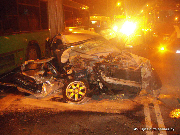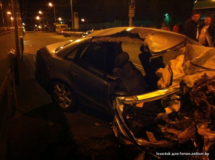Мало что осталось и от кузова Audi A4 в мае 2012 года. Это немудрено, ведь водитель врезался сразу в два автобуса. Первый удар пришелся на стоящий на ул. Кольцова в Минске МАЗ, затем машину отбросило на встречную полосу — под второй пассажирский МАЗ. После столкновения Audi загорелась. Целыми у седана остались разве что багажник и левая задняя часть кузова. Как утверждал сам молодой человек, находившийся за рулем легковушки, он ехал со скоростью 60 км/ч, не увидел автобус и совершил ДТП. Объяснение подписать не смог, сославшись на плохое самочувствие. Как оказалось позже, парень был нетрезв. Сам он пострадал несильно, а вот девушка-пассажир получила несколько открытых переломов конечностей.