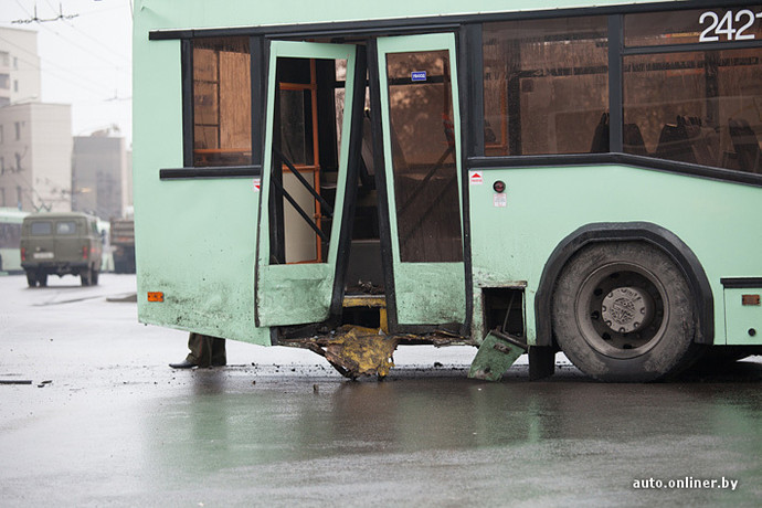 А вот что бывает, когда в крепкий кузов новых моделей «Белкоммунмаша» врезается легковушка. В ноябре 2012 года произошло столкновение троллейбуса и BMW. Свидетелями стали не только жители столицы, но и гости — ДТП случилось прямо напротив минского железнодорожного вокзала. У АКСМ оказались помяты задние двери, а вот седан восстановлению уже не подлежал. Автомобиль проехал прямо на запрещающий сигнал светофора, сообщали в ГАИ. Водителя легковушки, а также двух пассажирок троллейбуса доставили в медучреждение.