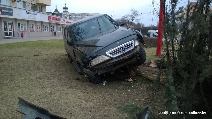 «За рулем SsangYong находился мужчина 1972 года рождения, с ним ехал пассажир, — рассказал Onliner.by и. о. старшего инспектора по агитации и пропаганде ГАИ Октябрьского района Сергей Маслов. — Внедорожник двигался со стороны улицы Кижеватова, на площади он столкнулся с маршрутным такси, после чего съехал с дороги и врезался в дерево».