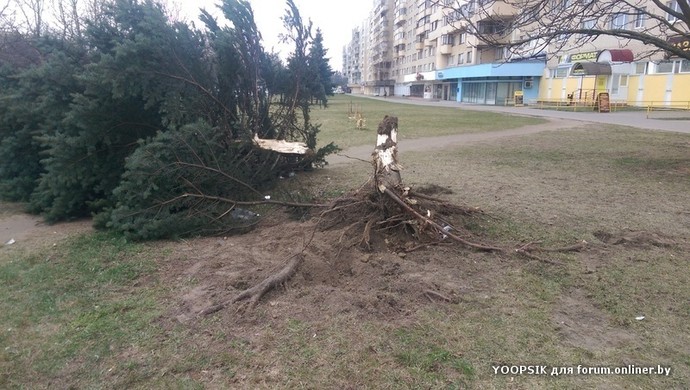 Необычную картину могли сегодня утром видеть жители столичного микрорайона Курасовщина. Кроссовер SsangYong оказался на зеленой зоне площади Казинца и врезался в елку, повалив ее на землю. В ГАИ Октябрьского района сообщили, что вылету за пределы проезжей части предшествовало столкновение на дороге. В результате аварии два человека получили травмы.