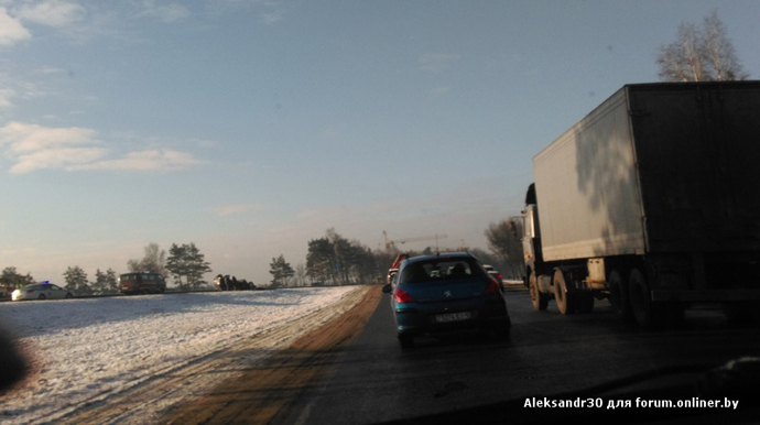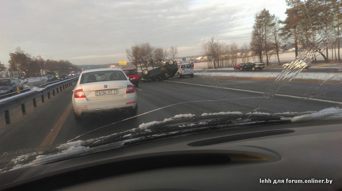 Утреннюю обстановку на трассе М3 Минск — Витебск можно назвать чрезвычайной. У «Очага» перевернулся Citroen. За ним стала образовываться пробка. Водители пытались тормозить на скользкой дороге. Случилось большое количество ДТП, какие-то с более серьезными последствиями, какие-то — с менее. Пользователь нашего форума с ником m_pashka86 разместил видео со своего регистратора. На километровом участке трассы он стал очевидцем схода в кювет Renault, видел последствия ДТП с участием трех автомобилей и проезжал мимо перевернувшегося Citroen.