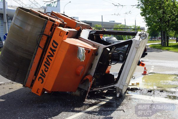 Инцидент произошел вчера около 16:10, сообщила корреспонденту Onliner.by начальник пресс-службы Госавтоинспекции региона Наталья Сахарчук. В Бресте на перекрестке с круговым движением с прицепа на проезжую часть упал многотонный асфальтоукладочный каток. Серьезно повреждены и техника, и дорожное покрытие.