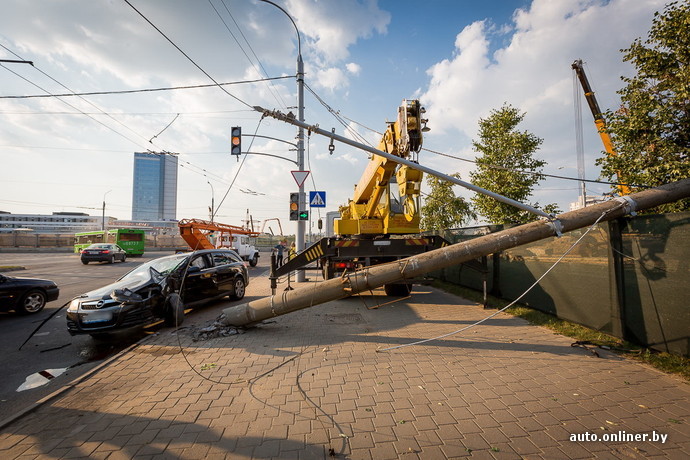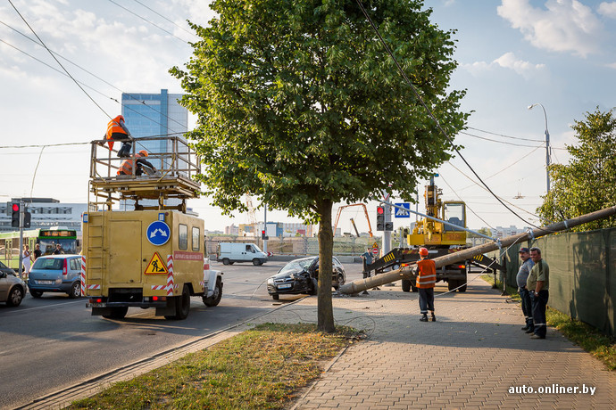 По словам очевидца, Opel двигался по улице Филимонова в направлении проспекта Независимости в крайнем правом ряду. Подъезжал к перекрестку. «В это время с прилегающей улицы Франциска Скорины не глядя вылетела красная Audi и на полном ходу врезалась в Opel. От удара его отбросило, и он столкнулся со столбом. Столб упал, оборвав все провода. Лег не на проезжую часть, а наоборот, туда, где раньше находился парк, а теперь ведутся строительные работы. Пешеходов вроде бы в этот момент поблизости не было», — рассказал нам wwwigor27.