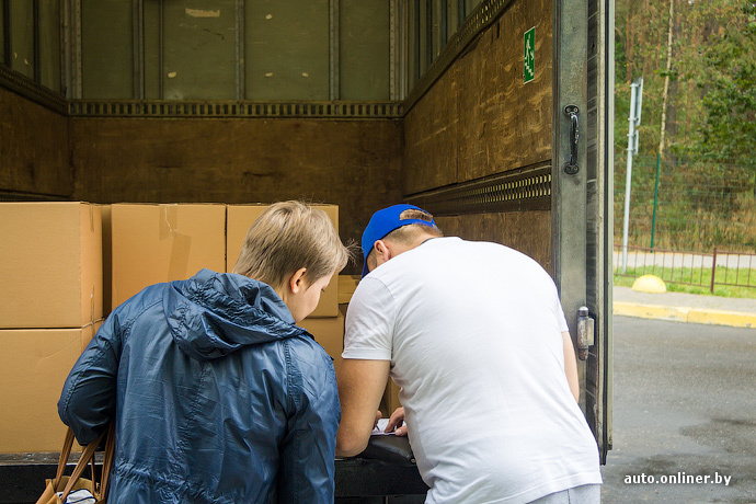 Спустить с третьего этажа несколько сот килограмм в коробках — дело не такое простое. Но поскольку носим вдвоем, работа спорится. Слаженно грузим коробки в кузов.