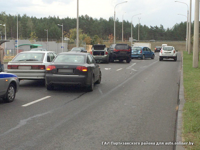 Сегодня около 9:20 на улице Ваупшасова произошла авария с участием шести автомобилей, сообщила корреспонденту Onliner.by старший инспектор по агитации и пропаганде ГАИ Партизанского района Татьяна Сподабаева. По цепочке друг с другом сталкивались Audi, Mitsubishi, Opel, Citroen, BMW и Renault. Много помятого металла, но люди, к счастью, не пострадали.