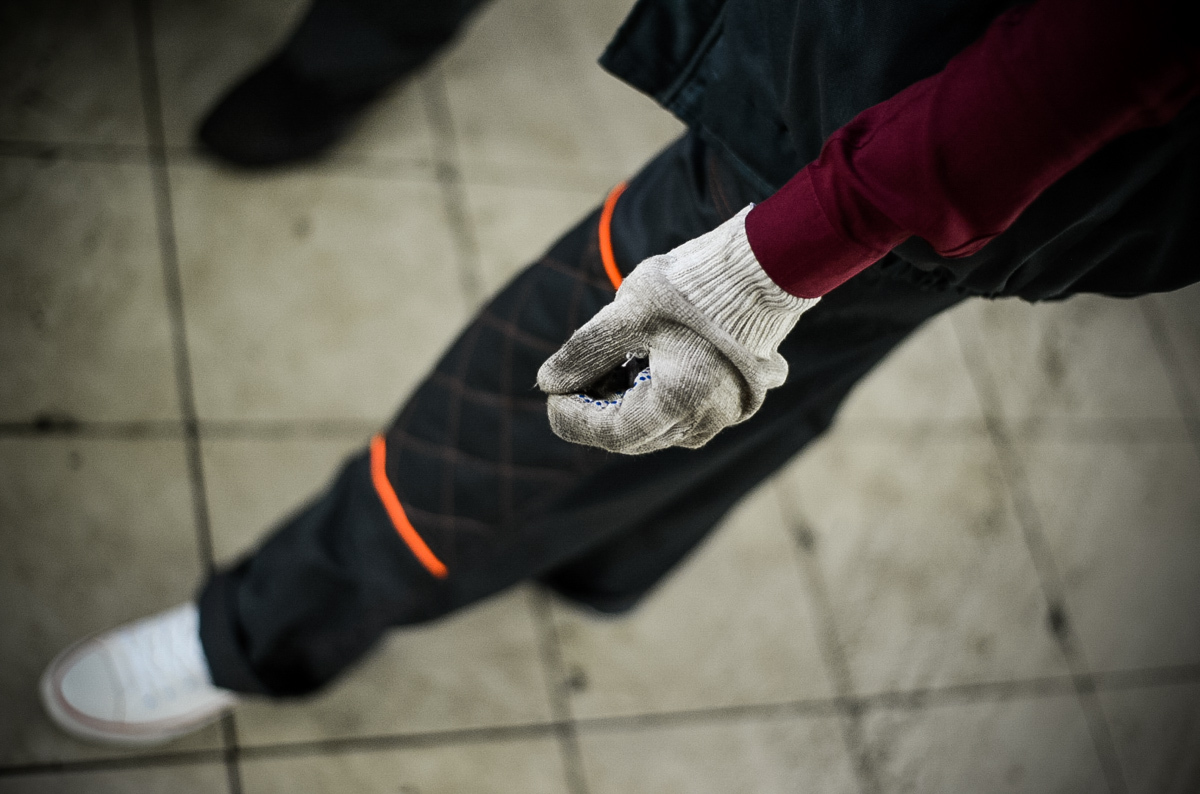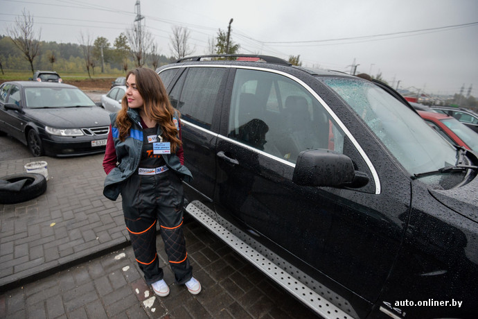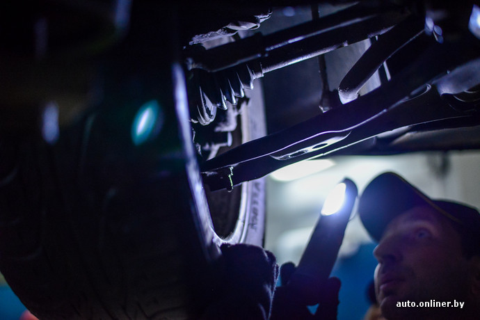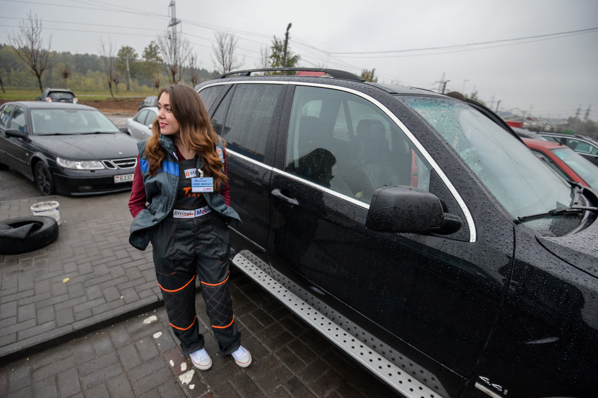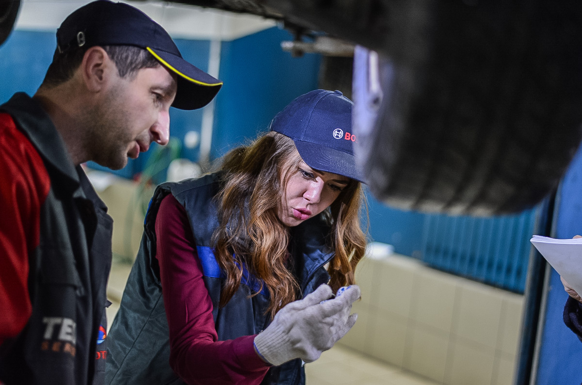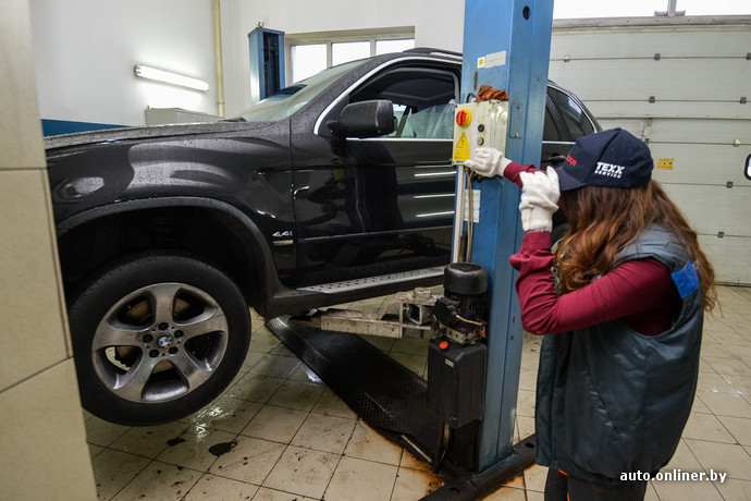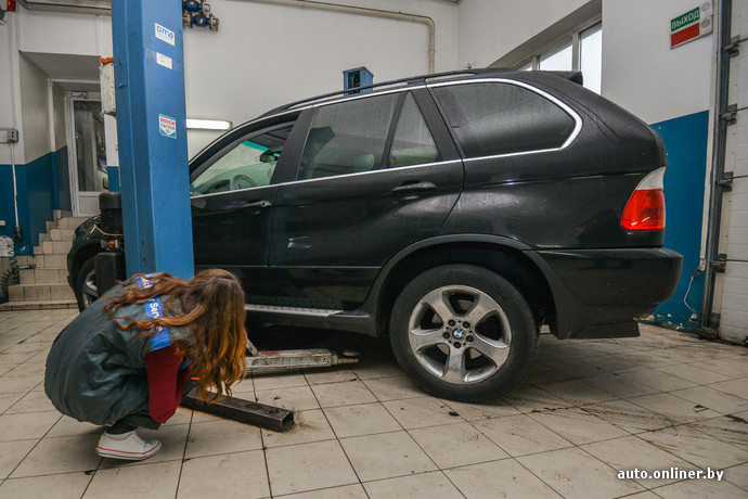 Наступает время настоящей грязной работенки. BMW X5 загоняют в бокс, предварительно застелив руль и сиденье пленкой. Девушка, которая подальше от беды решила проехать на пассажирском сиденье, меняет беджи: Кристина-приемщик теперь в прошлом, на арену выходит Кристина-слесарь. Кроссовер собираются осмотреть на подъемнике. Перед тем как подставить лапки в нужные места на днище, менеджеру сети по продаже косметики приходится в прямом смысле стать на колени перед BMW. Белые еще секунду назад перчатки покрываются дорожной грязью. Когда ее длинные волосы коснулись грязной плитки, мы всерьез задумались, что девушка не простит нам эту затею.