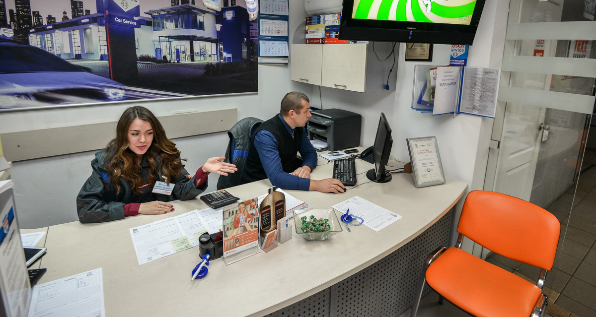 Знакомство с профессией началось за столом заказов. После непродолжительной инструкции и вводного «селфи» мастер-приемщик был готов к работе. Журналисты лишь издалека наблюдали за всем действом, боясь спугнуть либо девушку, либо клиента. На пороге станции появилась автовладелица — как оказалось позже, в ее BMW X5 сломалась рулевая крестовина. Несколько минут дамы беседуют, клиент заполняет бумаги и вскоре удаляется, будто бы и не заметив подмену.