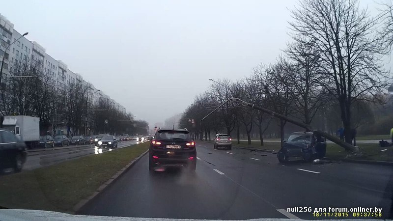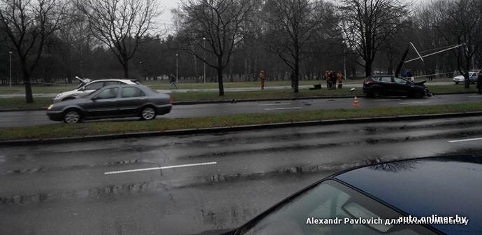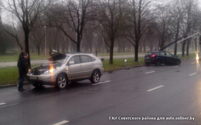 «Ford двигался со стороны пл. Бангалор в направлении ул. Кульман в средней полосе, — рассказали Onliner.by в ГАИ Советского района. — Lexus двигался в крайнем правом ряду. По словам свидетелей, водитель Ford начал перестраиваться вправо, не пропуская Lexus. Произошло столкновение, от которого Ford залетел второму автомобилю на капот. При этом бампер и фары Lexus остались целы, повреждена только крышка капота».