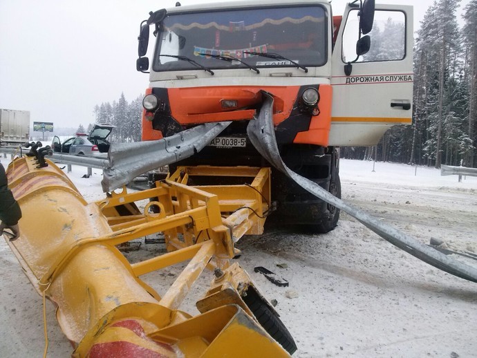 Водитель Volvo, житель Молодечненского района, двигался по автодороге М14, впереди него двигались два уборочных автомобиля МАЗ-МАН на расстоянии 80 метров между собой. Опередив по второй полосе один из грузовиков, водитель для нового опережения перестроился в первую полосу и начал маневр, но не увидел, что первый автомобиль дорожной службы оборудован дополнительным снегоуборочным отвалом.