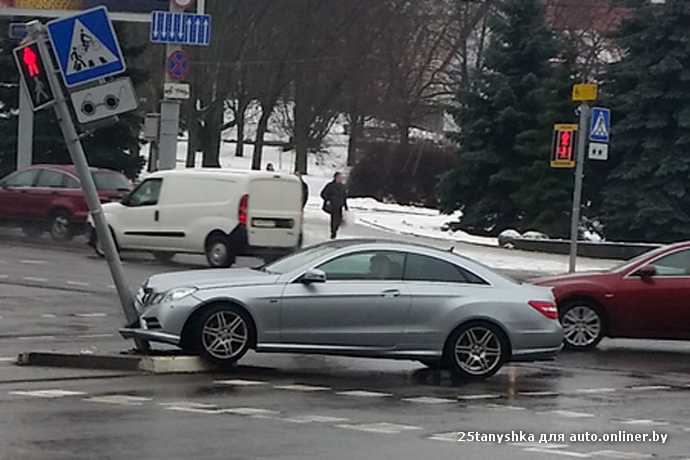 ДТП произошло сегодня днем на перекрестке Немиги и Городского Вала в Минске. Водитель автомобиля Mercedes E-Class Coupe врезался в светофор на островке безопасности. Судя по фото, в ДТП никто не пострадал. Автомобилем управляла молодая женщина.