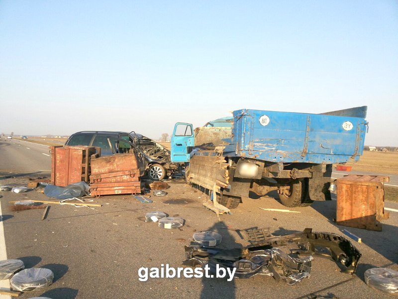 Сегодня около 7:30 на 106-м км автодороги М1 (Брест — Минск — граница России) в Березовском районе столкнулись Volkswagen Sharan и грузовик ГАЗ. По предварительной информации, оба автомобиля двигались в одном направлении. Из кузова грузовика на проезжую часть выпали контейнеры и другие предметы. Движение было затруднено.