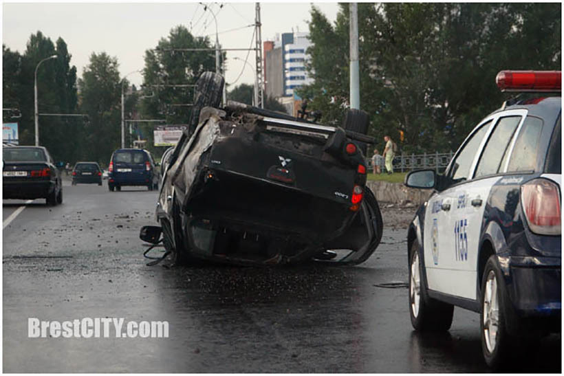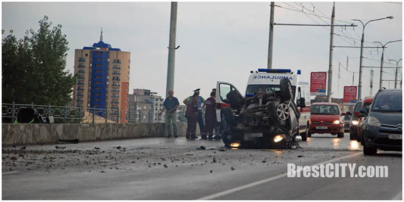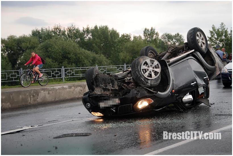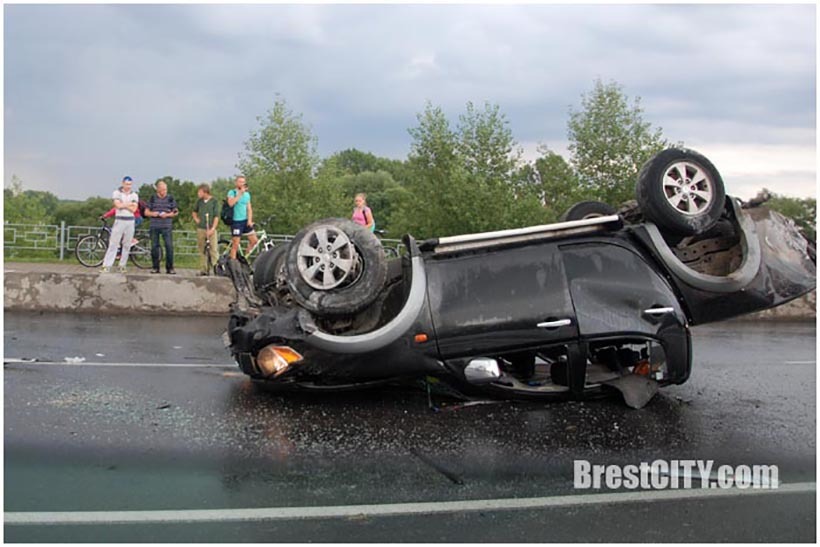 «Ехал автомобиль, обогнал меня, метров через 10 его понесло резко влево, — приводит слова очевидца „Виртуальный Брест“. — Ударился об отбойник, благо „встречки“ не было. Дальше полетел кувыркаться: крыша — колеса — крыша. Хорошо хоть жив остался! Железо стерпит».