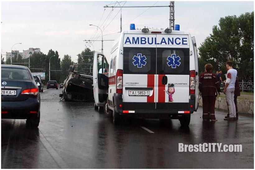 Mitsubishi L200 двигался по мосту в Бресте и по непонятной пока причине принял резко влево. После этого пикап врезался в бордюр и перевернулся. На место происшествия прибыла машина скорой помощи, очевидцы видели только одного пострадавшего — молодого человека с перебинтованной рукой. Местные жители предполагают, что причиной резкого маневра водителя могло стать скользкое покрытие.