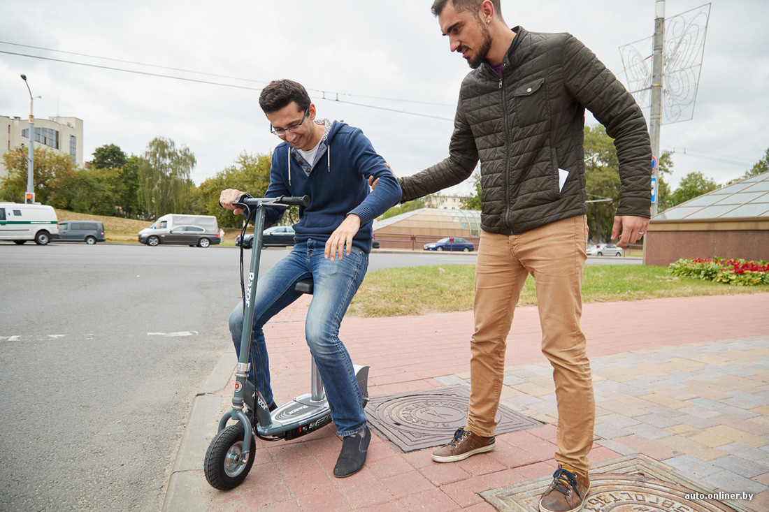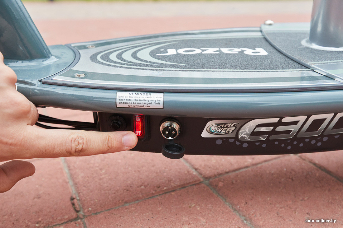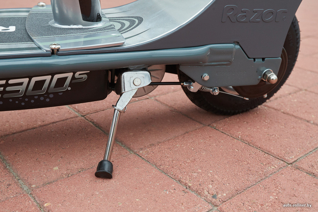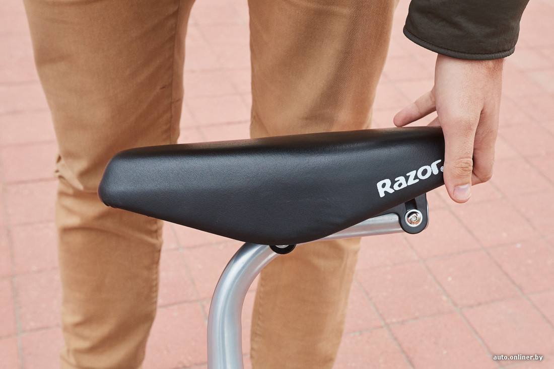 Второй самокат, попавший к нам на тест, стоит на 30 рублей дороже и имеет абсолютно другую целевую аудиторию. Модель E300S от компании Razor намного крупнее конкурента и даже имеет сиденье (которое можно демонтировать при наличии специального ключа). Весит устройство 23,5 кг. Оно не складывается, и нести его одному человеку крайне неудобно. Если дома нет лифта и живете вы не на первых двух этажах, забудьте о данной модели. Разместить E300S в багажнике автомобиля тоже проблематично — придется разбирать, а это лишняя работа и дополнительная ноша в рюкзаке (три ключа разного размера типа «икеевских» шестигранников).