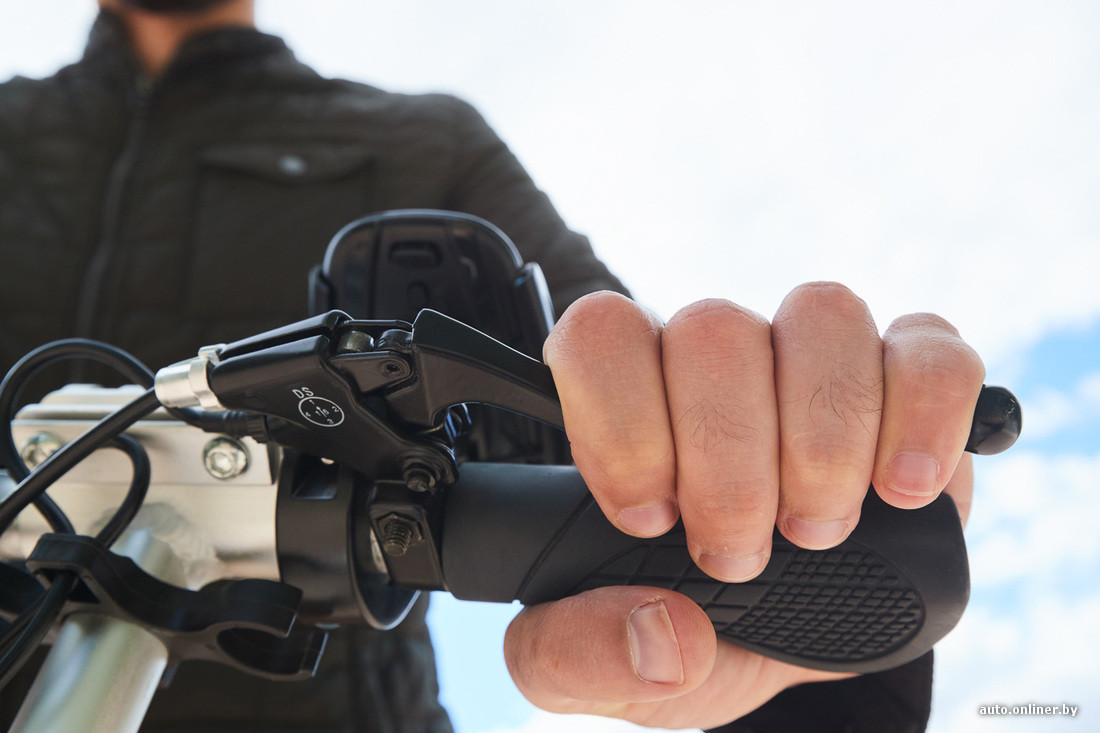 Перед началом движения самокат необходимо включить — клавиша расположена прямо на аккумуляторе. Электротягой управляешь правой рукой с помощью небольшого рычажка. Подача крутящего момента на заднее колесо линейная, но по факту есть два режима — полный газ и накат. Тормоз расположен на левой рукоятке (тормозит только заднее колесо). Высоту руля можно регулировать (всего три положения). Максимальный вес ездока — 100 кг. Самокат без труда разгоняется до скорости 11—13 км/ч. На ровной дороге легко можно набрать 15—17 км/ч. Тяги хватает, чтобы заезжать на мостики велодорожки (куда не каждый велосипедист заедет).