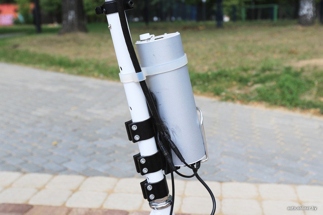 Весит модель 11,6 кг. Не натаскаешься по супермаркетам или бизнес-центрам, хотя занести домой труда не составит. Конечно, не сравнить с классическими самокатами весом по 5 кг, но чудес не бывает: здесь на заднем колесе — электромотор, а на руле — «баллоноподобный» аккумулятор. Кстати, батарея съемная, и можно купить вторую (329 рублей), увеличив стандартный запас хода (по нашим замерам — около 15 км) в два раза. При желании аккумулятор можно снимать и заряжать отдельно от самоката. Это удобно, если хранишь устройство в багажнике машины.